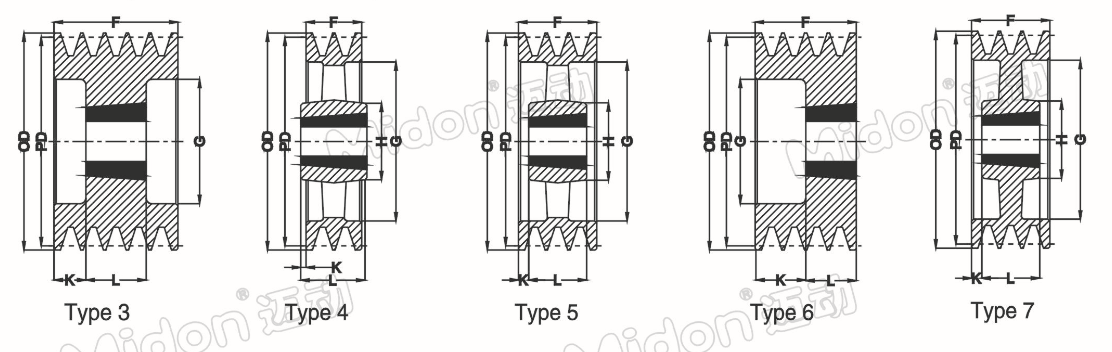 | pulley Type | Minimum Outside Diameter | pitch Diameter | Groove Angle | 槽項寬 | 節線寬 | 輪槽深 | 節線邊 | 槽中柜 | 槽邊距 |