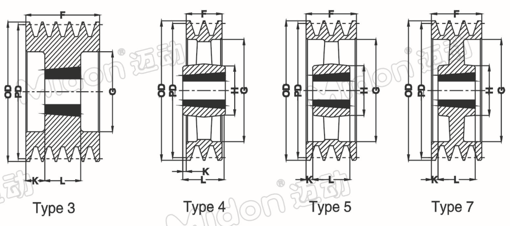 | pulley Type | Minimum Outside Diameter | pitch Diameter | Groove Angle | 槽項寬 | 節線寬 | 輪槽深 | 節線邊 | 槽中柜 | 槽邊距 |